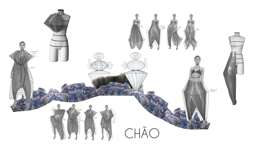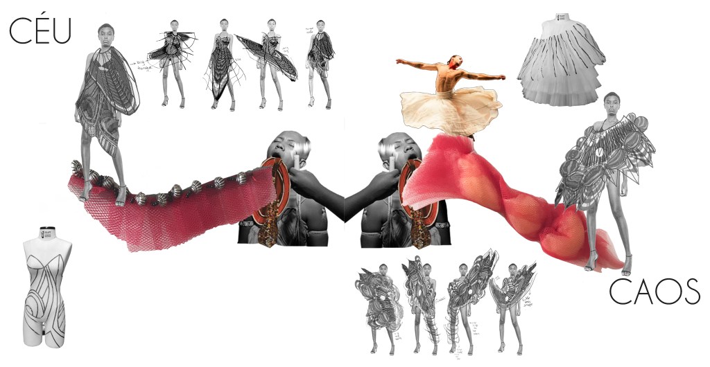 Runway show inspired by aspects of Brazilian identity that were severely repressed during Portuguese colonization. In Umbanda, the terreiros open their doors to connect with the Orixás. Céu represents paradise and the divine. Chãorepresents the human element and sin. Caos represents the presence of the Orixás.