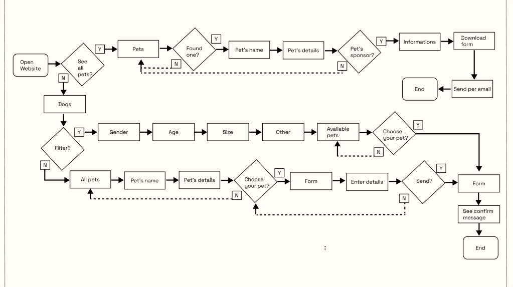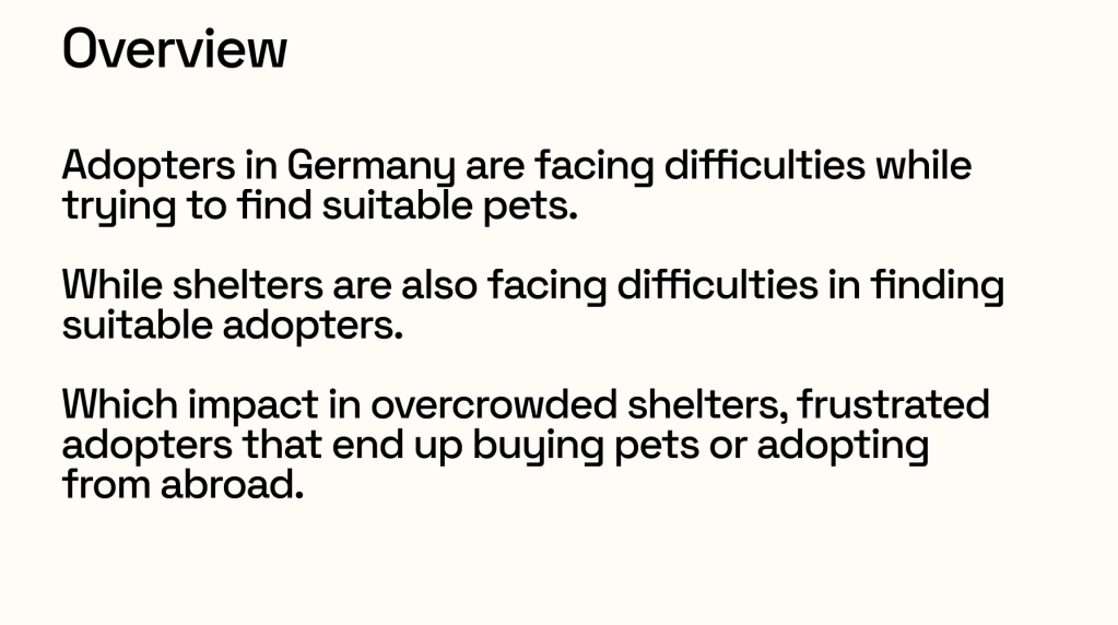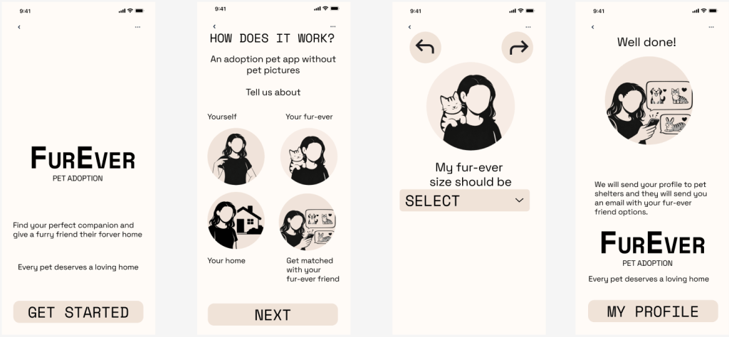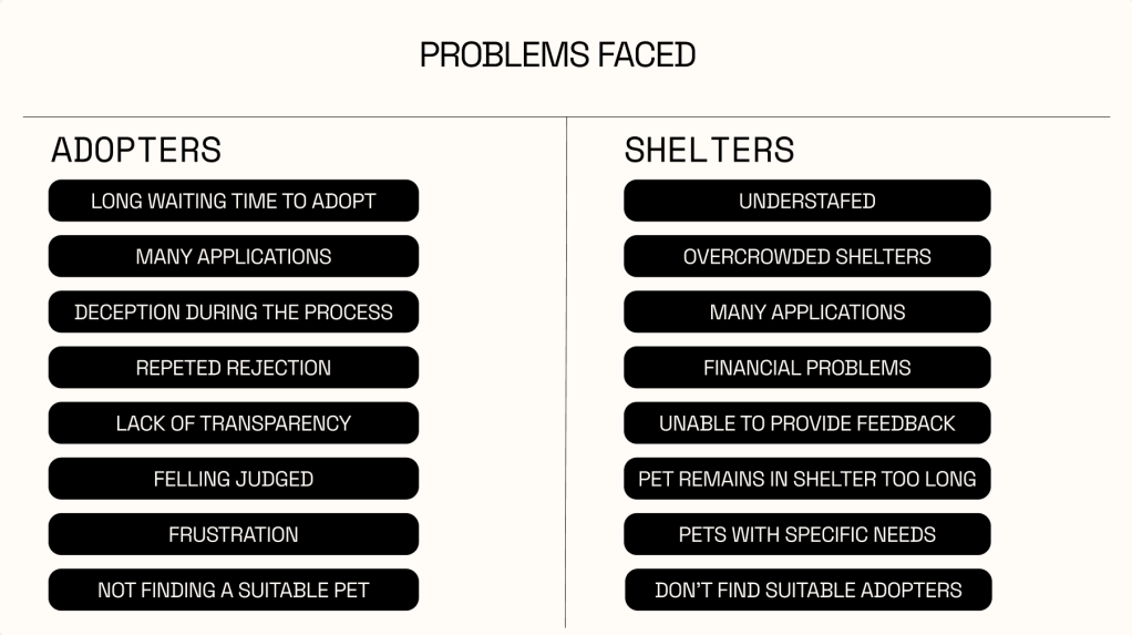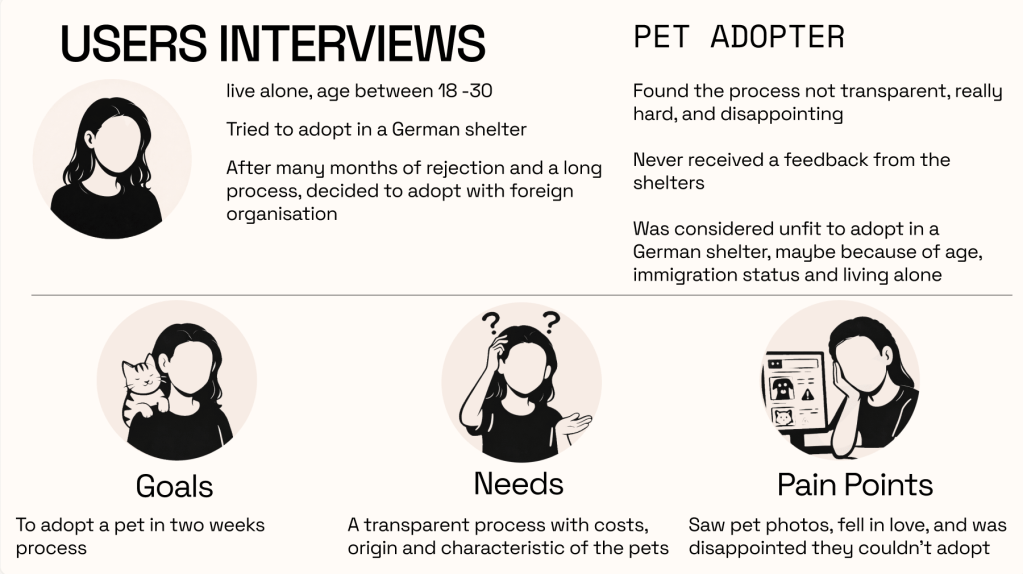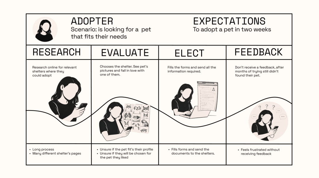 Ongoing UX project: Mobile app designed to create adopter profiles, simplifying the pet adoption journey and increasing trust and successful matches between adopters and shelters.